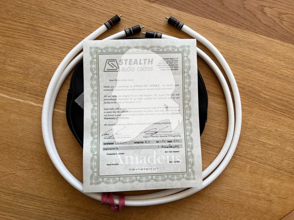 STEALTH AUDIO CABLES OUTLET Stealth Indra V.08+ RCA connectors 1 meter pair unused original bag and certificate included. The Certificate is also the lifetime warranty
